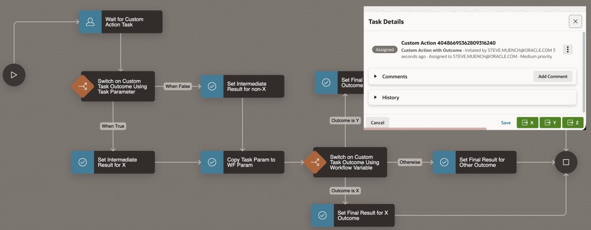 The workflow definition shown below waits for an Action Task, passing the APEX$WORKFLOW_INITIATOR built-in workflow variable value as the Task Initiator. Then the flow uses different Switch activities to take different paths depending on the task’s custom outcome. In this example, the different outcome values simply assign different values to two workflow variables INTERMEDIATE_RESULT and FINAL_RESULT, but in your own workflows the paths can contain any activities you need.