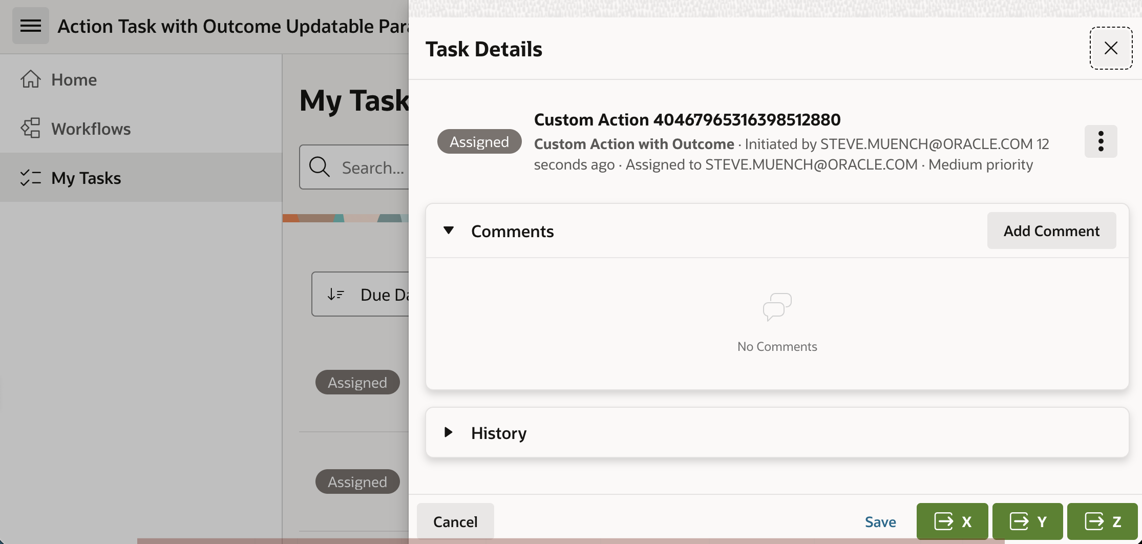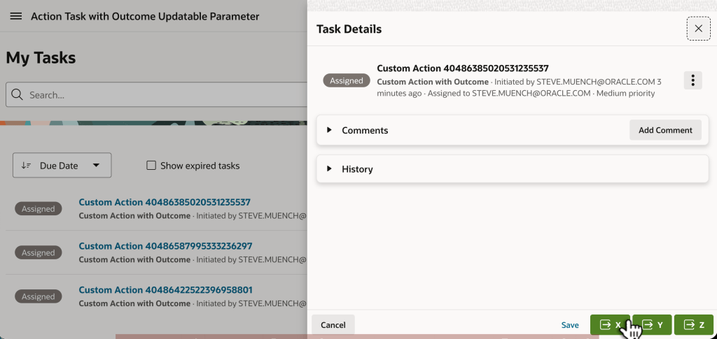 Next, use the My Tasks page to respond to each of the action tasks assigned to you. In one each, try clicking the (X), (Y), and (Z) button.