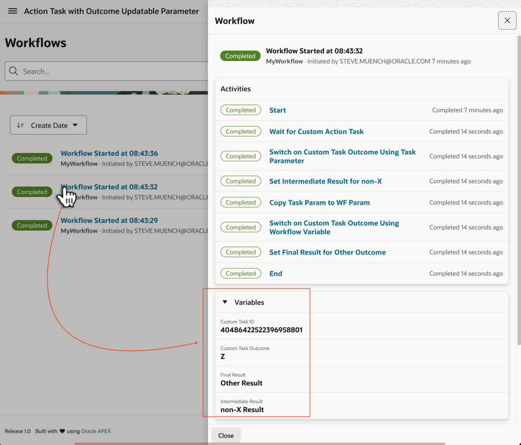 In both the My Tasks page and the Workflows page, I made one minor change to the SQL query of the generated page’s Content Row region. I simply uncommented the ,p_application_id => :APP_ID parameter to pass the current application ID to the apex_human_tasks.get_tasks pipelined table function returning the data to display. Otherwise, by default the pages show tasks and workflows from all applications in the workspace.