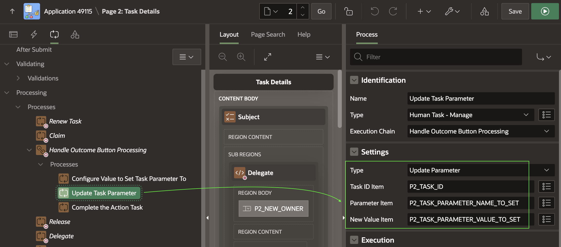 The second Update Task Parameter child process in the chain uses the declarative Human Task ‑ Manage page process, with type set to Update Parameter. It updates the parameter whose name is in P2_TASK_PARAMETER_NAME_TO_SET and whose value is in P2_TASK_PARAMETER_VALUE_TO_SET on the task instance whose ID comes from P2_TASK_ID.