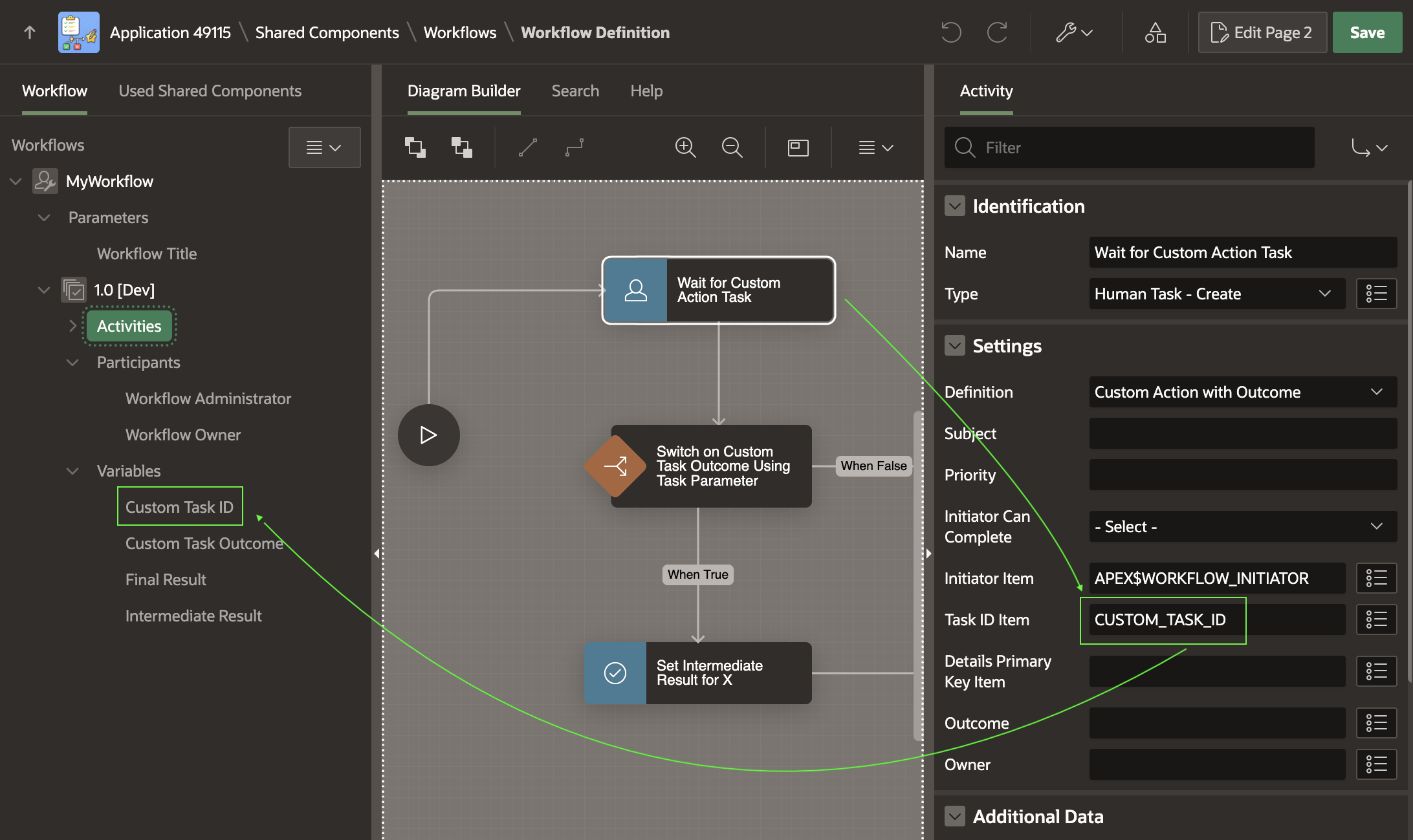 Here, the CUSTOM_TASK_ID is a workflow version variable I added and then used as the Human Task ‑ Create activity’s Task ID Item as shown below. This makes it store the task instance ID into the CUSTOM_TASK_ID variable when the task owner completes the task.