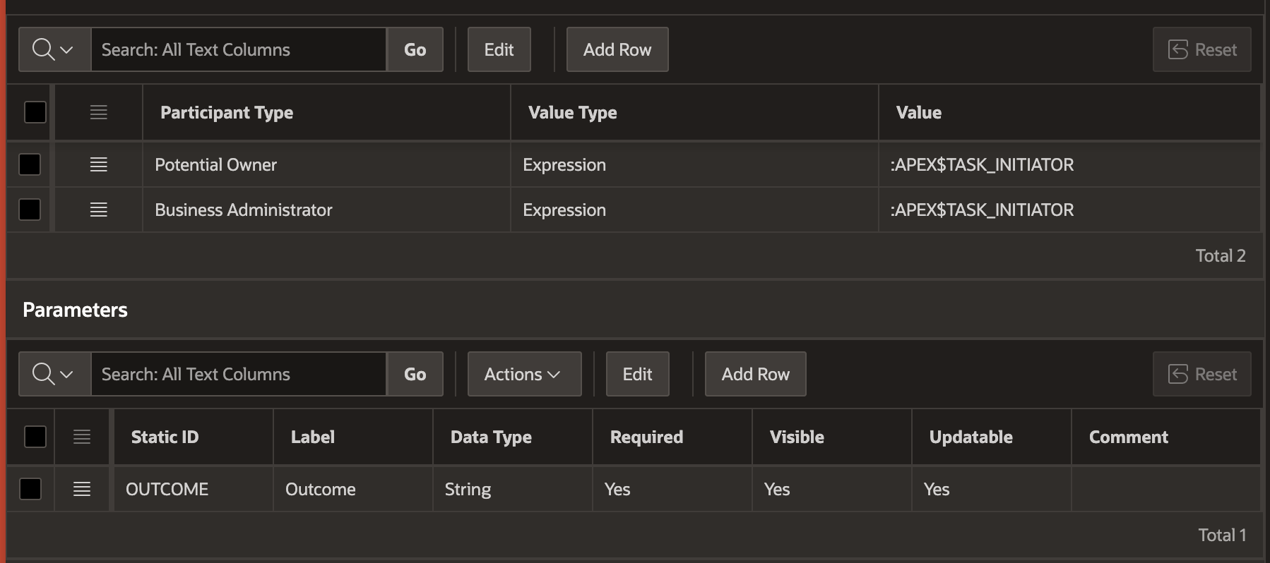 Since we want to set the task parameter named OUTCOME, the P2_TASK_PARAMETER_NAME_TO_SET has a static default value: OUTCOME