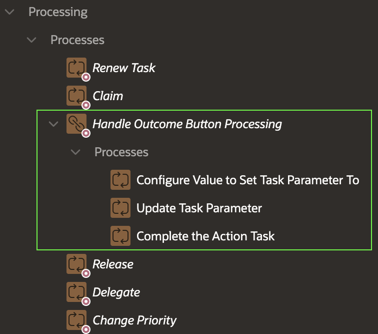 This condition ensures the chain’s child processes only run if the user presses one of the custom outcome buttons. The execution chain’s Run in Background switch is off, so when they run, they happen immediately in the current user session during page submit processing.