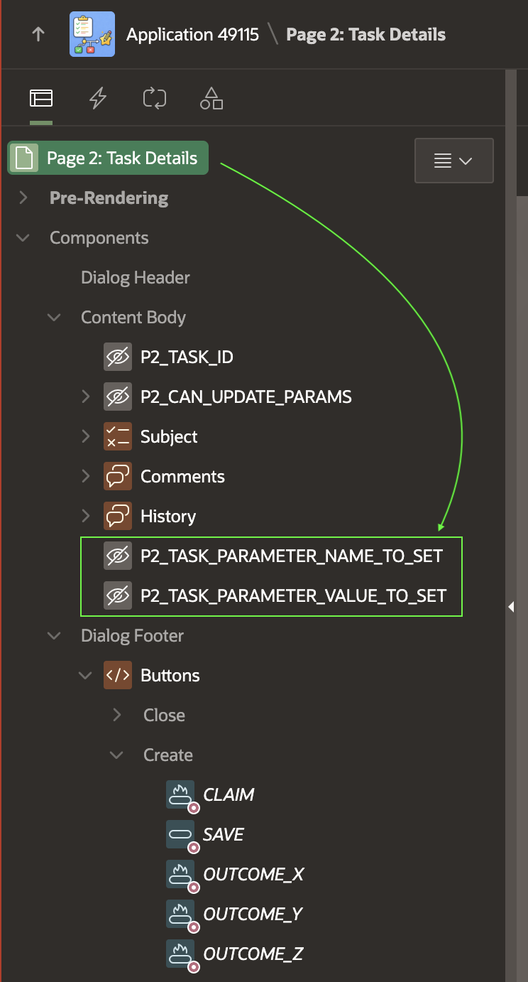 The Update Parameter feature of the declarative Human Task – Manage page process expects the name of the task parameter to be stored in a page item. It also expects the parameter value to come from a page item. So, I’ve added two hidden page items shown below for that purpose. I set their Storage to In‑Memory Only so their values don’t persist across page visits:
