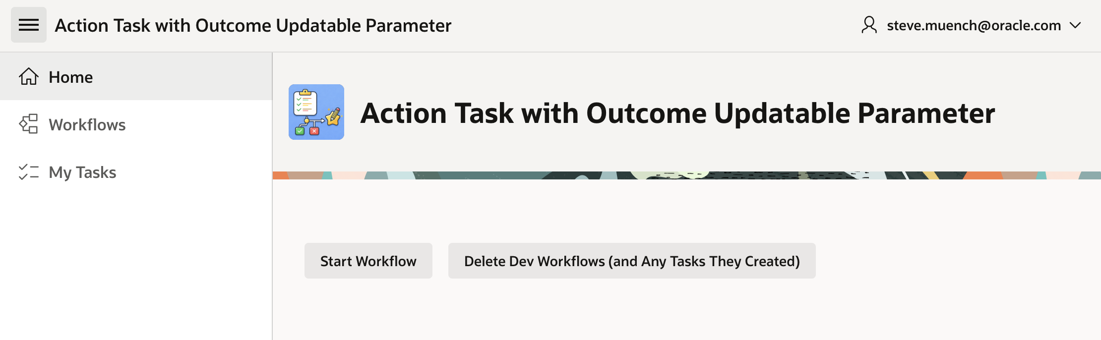 The sample also contains a My Tasks page I generated with the Create Page wizard by choosing Unified Task List and picking the context of My Tasks. It shows the user open tasks assigned to them. I also created the Workflows page using the same wizard, by picking Workflow Console instead.