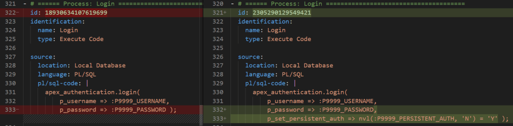 Starting with APEX 22.1, the readable YAML export option allows much easier code reviews since it presents the application component metadata in an easy-to-understand text outline with property names and values that match what you see as a developer in the APEX builder. To export the readable YAML version of an app, we can use the new READABLE_YAML export type: